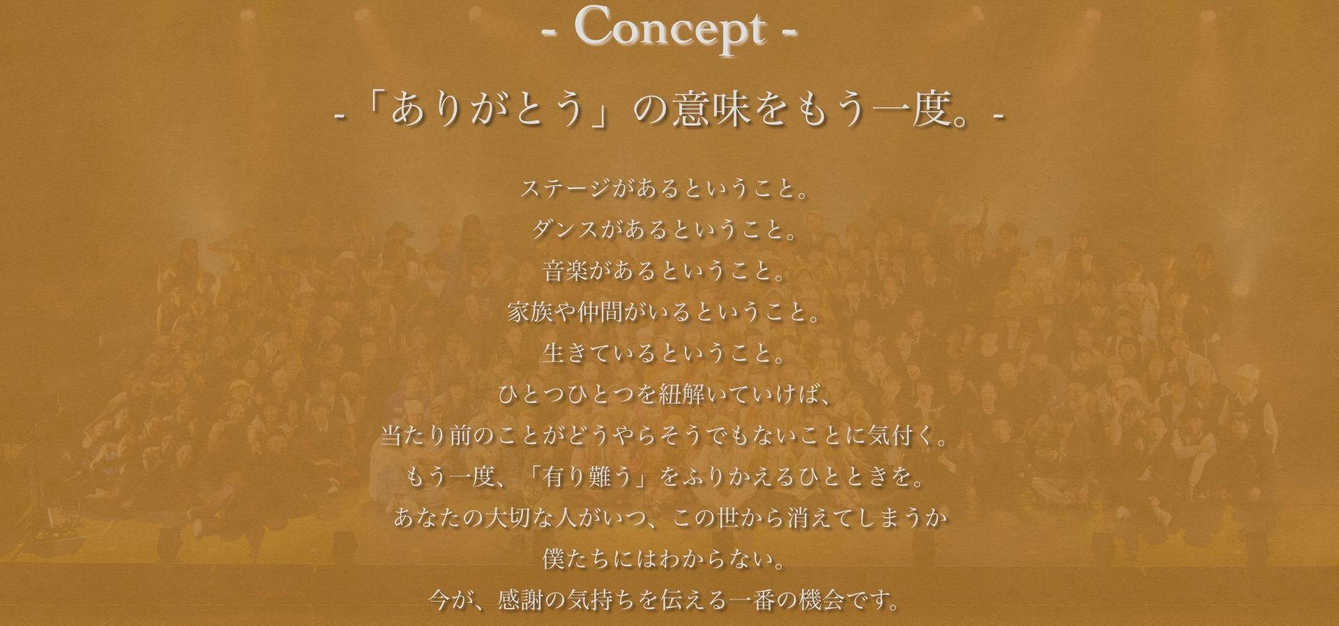 初めて立って、歩くことができた時の喜びや初めて言葉を発した時の感覚や景色なんてもう忘れてしまっている。いま空気があって呼吸ができていることすらも、「当たり前」だけど実は「ありがたい」んだ。こういう一つひとつのありがたみを見つけることは生きている喜びに気付くこと。その感謝を全身で表現しよう。歌に乗せて分かち合おう。それが僕らの生き様となり、大切な人たちに届くから。